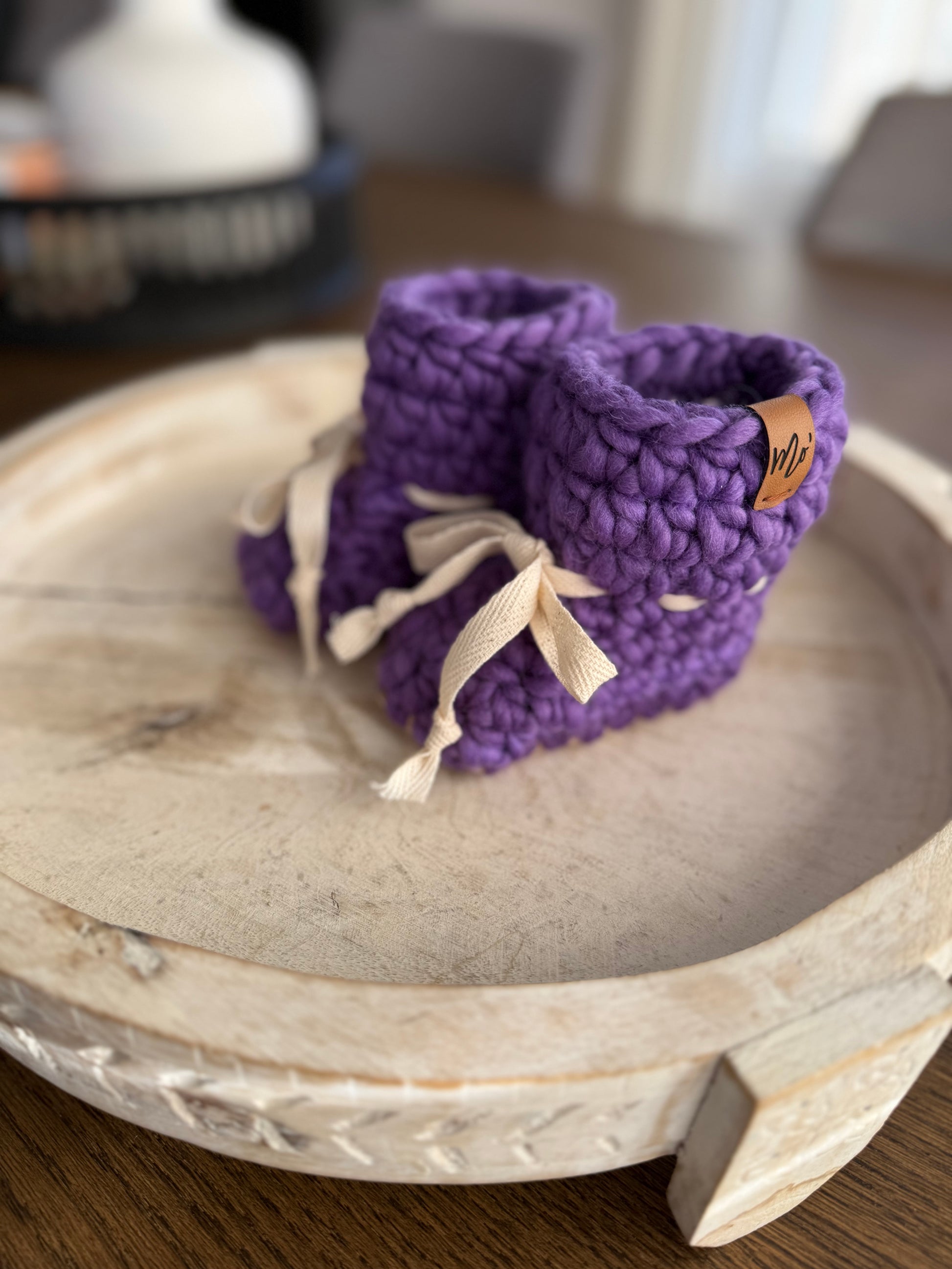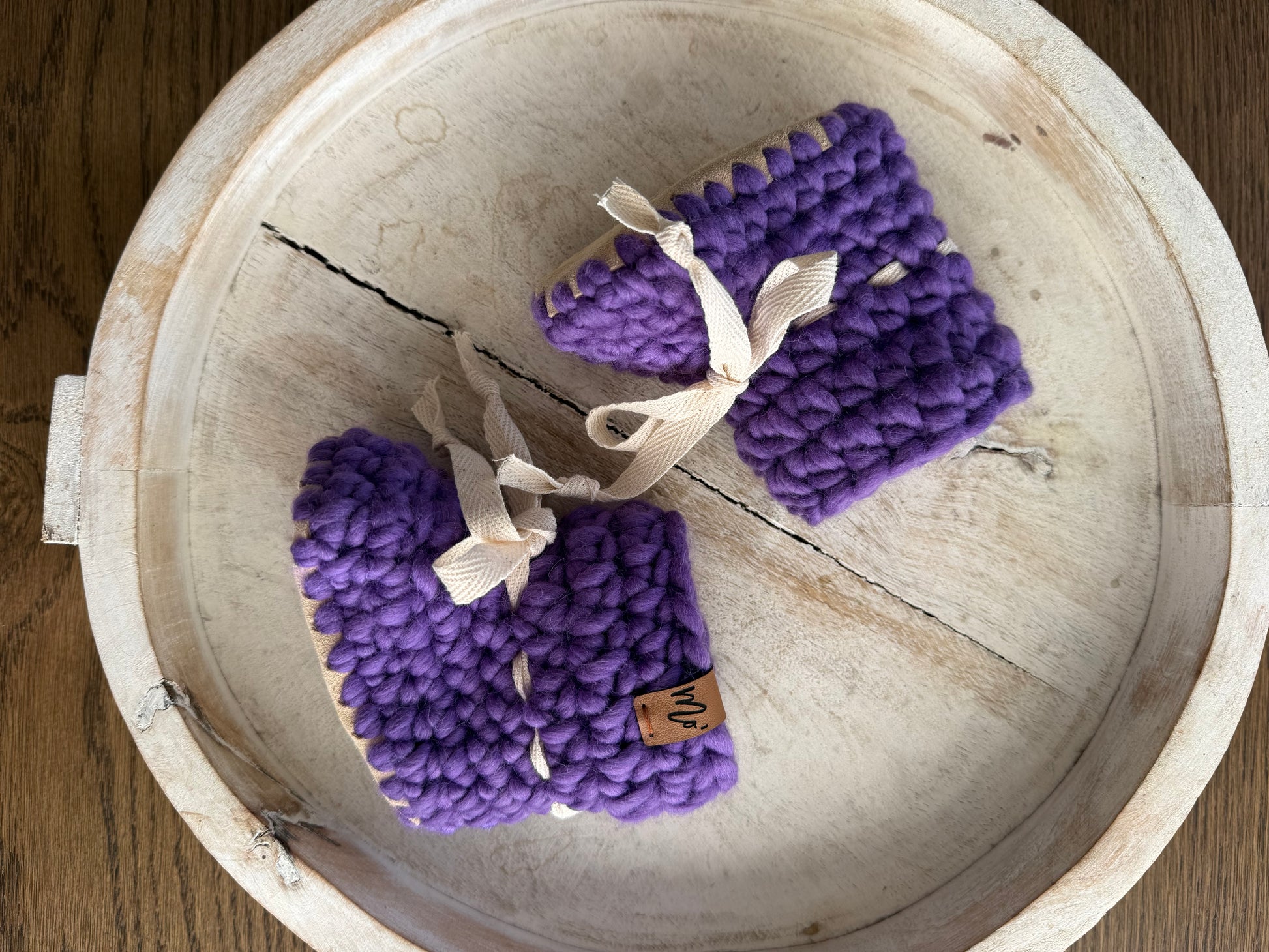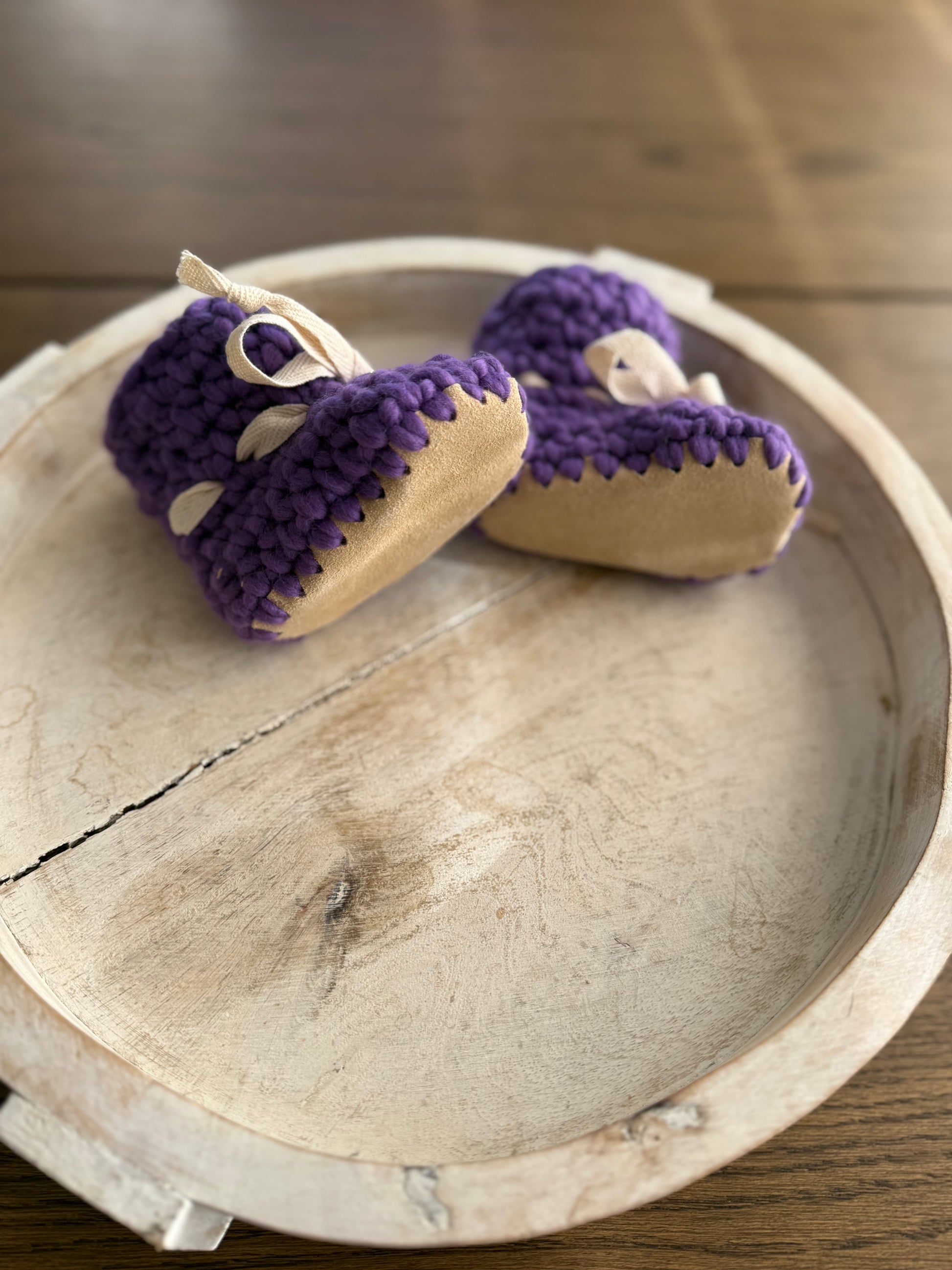 These booties are made with merino wool. Inside has sheepskin for extra coziness and helps with sweat wicking. The bottoms are made of suede leather. The colour is Purple