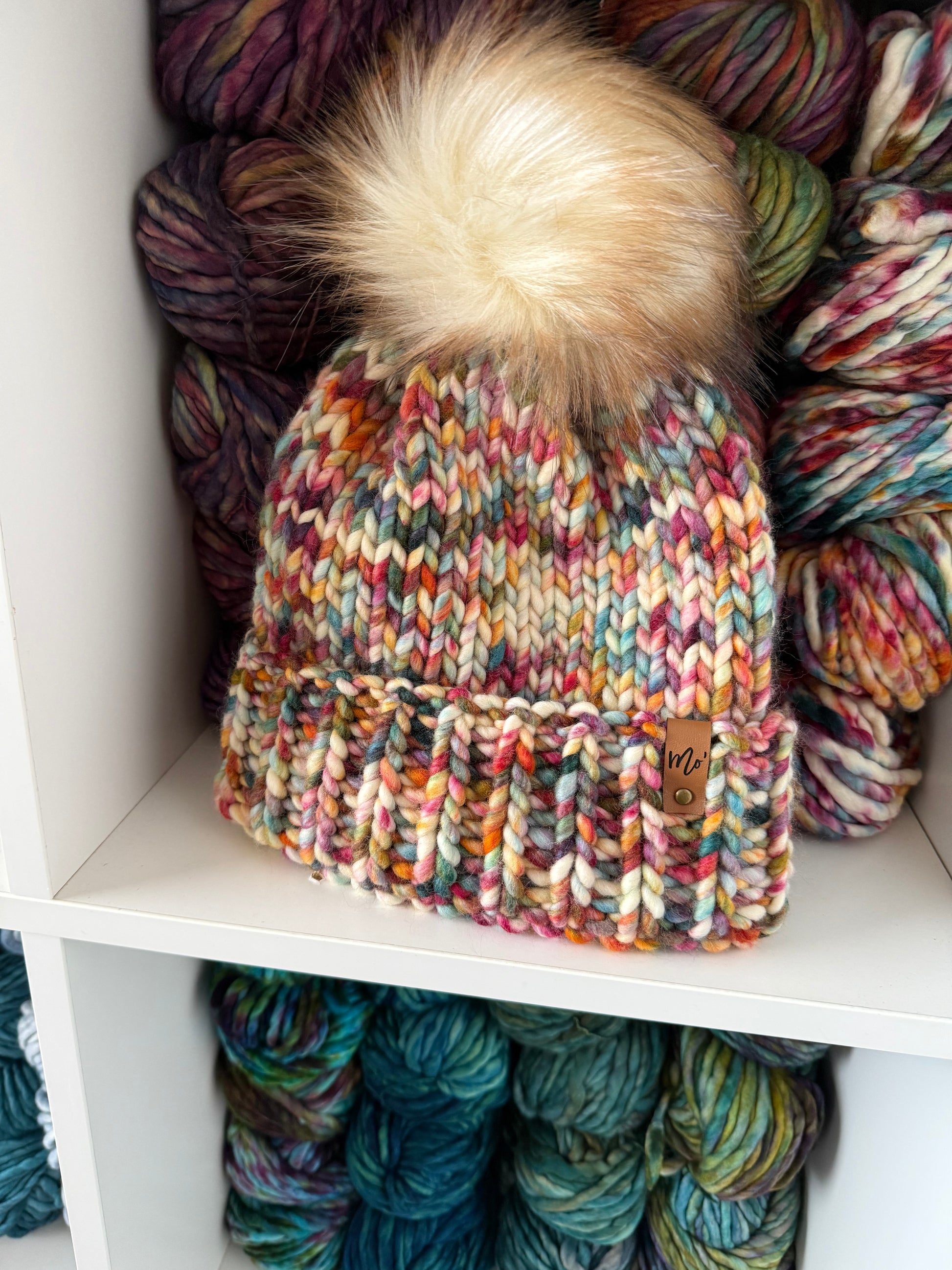 This knit hat is made of hand dyed superwash merino wool, adorned with a 6” handmade faux fur pom.